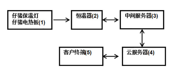 恒溫器設(shè)定好仔豬適宜的溫度區(qū)間以及保溫燈和電熱板的工作狀態(tài),再把保溫燈和仔豬電熱板的運行數(shù)據(jù)與中間服務(wù)器、云服務(wù)器進行交互;