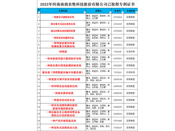 今年未完,南商農(nóng)科就獲得了17項發(fā)明專利;從2009年到2022年,南商農(nóng)科研發(fā)團隊已經(jīng)取得了80余項國家專利,20余項軟著,歷經(jīng)4代產(chǎn)品升級,先后研發(fā)了種豬測定站、小智倌妊娠、哺乳、保育育肥一體機等6大系列全套智能化養(yǎng)豬設(shè)備;?這些成就的取得是因為每一個南商人在平凡的崗位上踐行著不平凡的使命——做中國知名的智慧化豬場總包服務(wù)商。在以后南商人仍然會積極開展技術(shù)創(chuàng)新,用更多的發(fā)明專利、更加精良穩(wěn)定的設(shè)備,為南商的客戶創(chuàng)造更多的收益,提供更大的價值。 路漫漫其修遠兮,吾將上下而求索,面對不斷變化的行情趨勢、日新月異的養(yǎng)殖需求,南商農(nóng)科始終堅持誠信鑄就南商,科技創(chuàng)造價值的理念;獲得了“國家科學(xué)技術(shù)進步二等獎”、“神農(nóng)中華農(nóng)業(yè)科技獎”、“服務(wù)型制造示范企業(yè)”、“省級專精特新企業(yè)”、“小巨人”