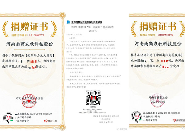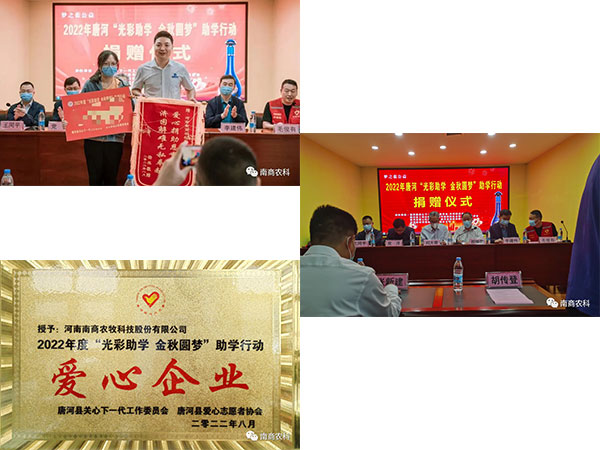 2013年,南商農(nóng)科董事長(zhǎng)曹沛先生積極響應(yīng)家鄉(xiāng)號(hào)召,于南陽(yáng)市唐河縣成立河南南商農(nóng)牧科技股份有限公司。如今,南商農(nóng)科依然不改初心,砥礪前行,以家鄉(xiāng)振興為己任,在今年的鄉(xiāng)村振興公益活動(dòng)中,南商農(nóng)科作為唐河縣慈善總會(huì)會(huì)員單位,積極助力唐河鄉(xiāng)村振興公益事業(yè)。