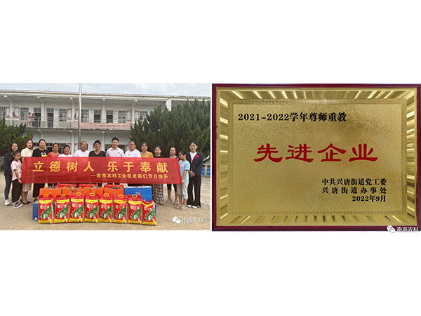 作為唐河縣產(chǎn)業(yè)集聚區(qū)的一份子,公司同樣關(guān)注產(chǎn)業(yè)集聚區(qū)教育發(fā)展和員工子女入學(xué)問(wèn)題,用實(shí)際行動(dòng)為地方教育事業(yè)作出積極貢獻(xiàn),也因此被授予2021-2022學(xué)年的“尊師重教先進(jìn)企業(yè)”。