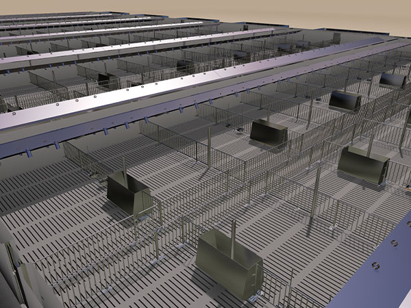 公豬與空懷母豬放在同1棟豬舍,公豬欄數(shù)為30欄,空懷母豬33圈,公豬欄面積為8.64 m2,欄長(zhǎng)為3.2 m,寬為2.7 m,高為1 m。空懷母豬群養(yǎng),5頭一圈,面積為9.6 m2,圈長(zhǎng)為3.2 m,寬3 m,高1 m。豬舍中間留一條1 m寬的通長(zhǎng)走道,走道兩側(cè)排列一列豬欄??傮w面積為720 m2,長(zhǎng)為90 m,寬為8 m。
